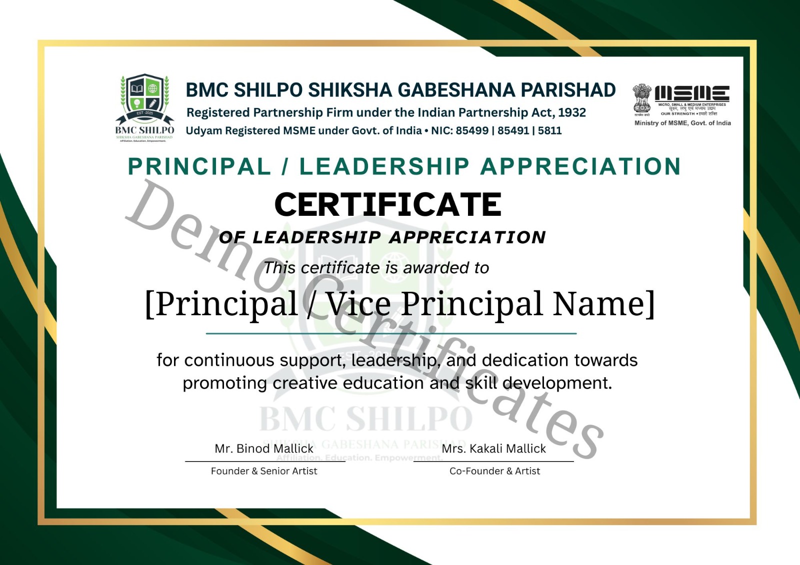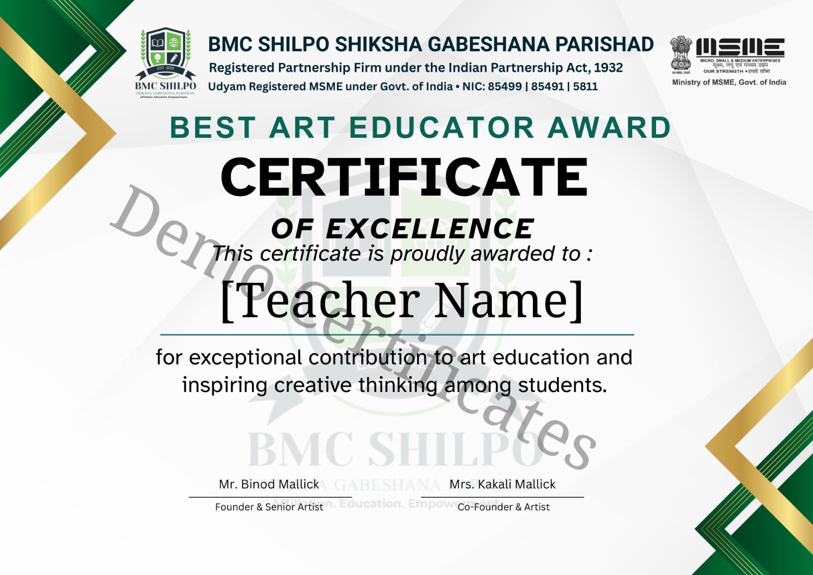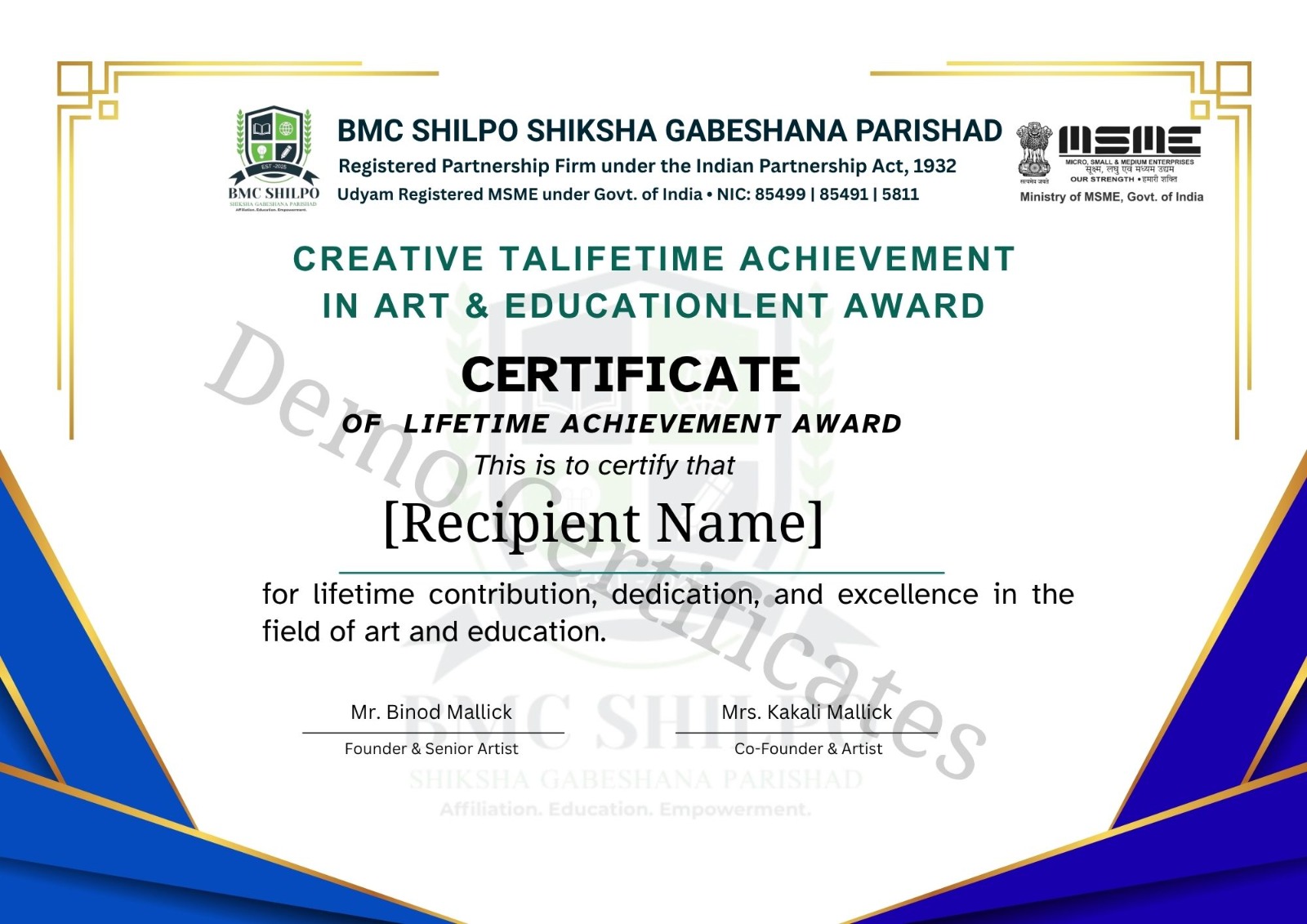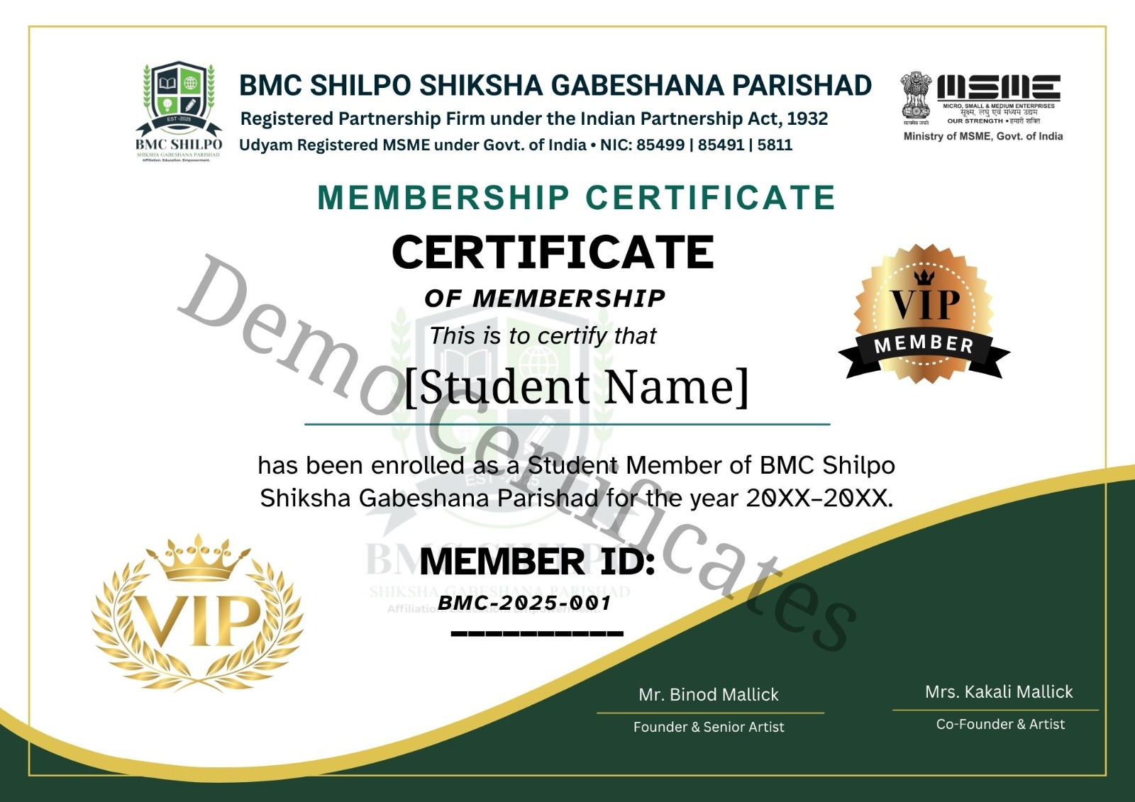 Co-Founder & ArtistI am proud to support a mission that empowers skills and promotes creative education. At BMC, we aim to provide quality training, recognition, and digital affiliation services for schools, trainers, artists, and students. With trust and professionalism, we work to build a future-ready skill society where learning and success have no limits.