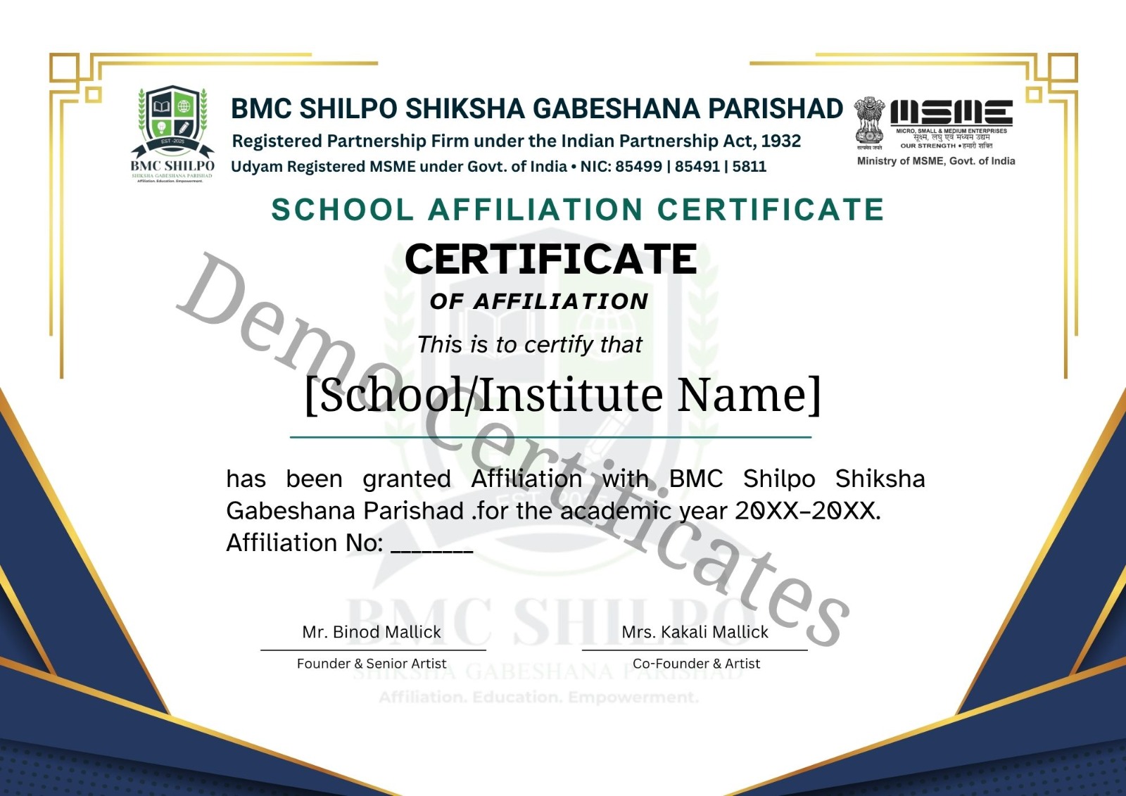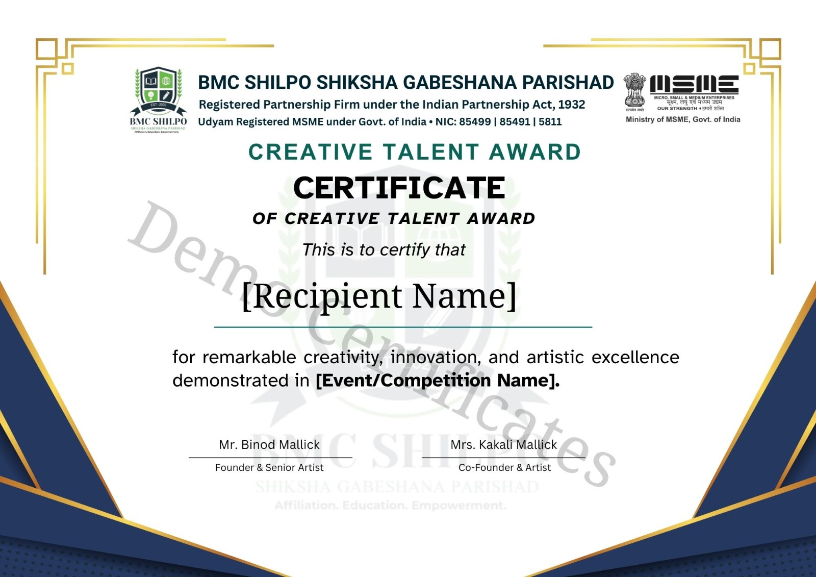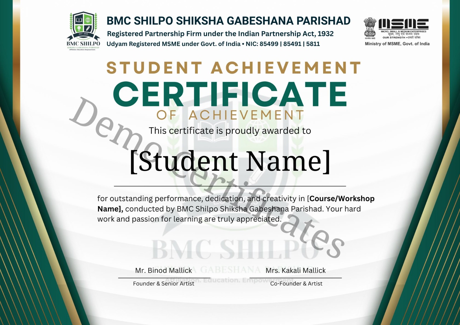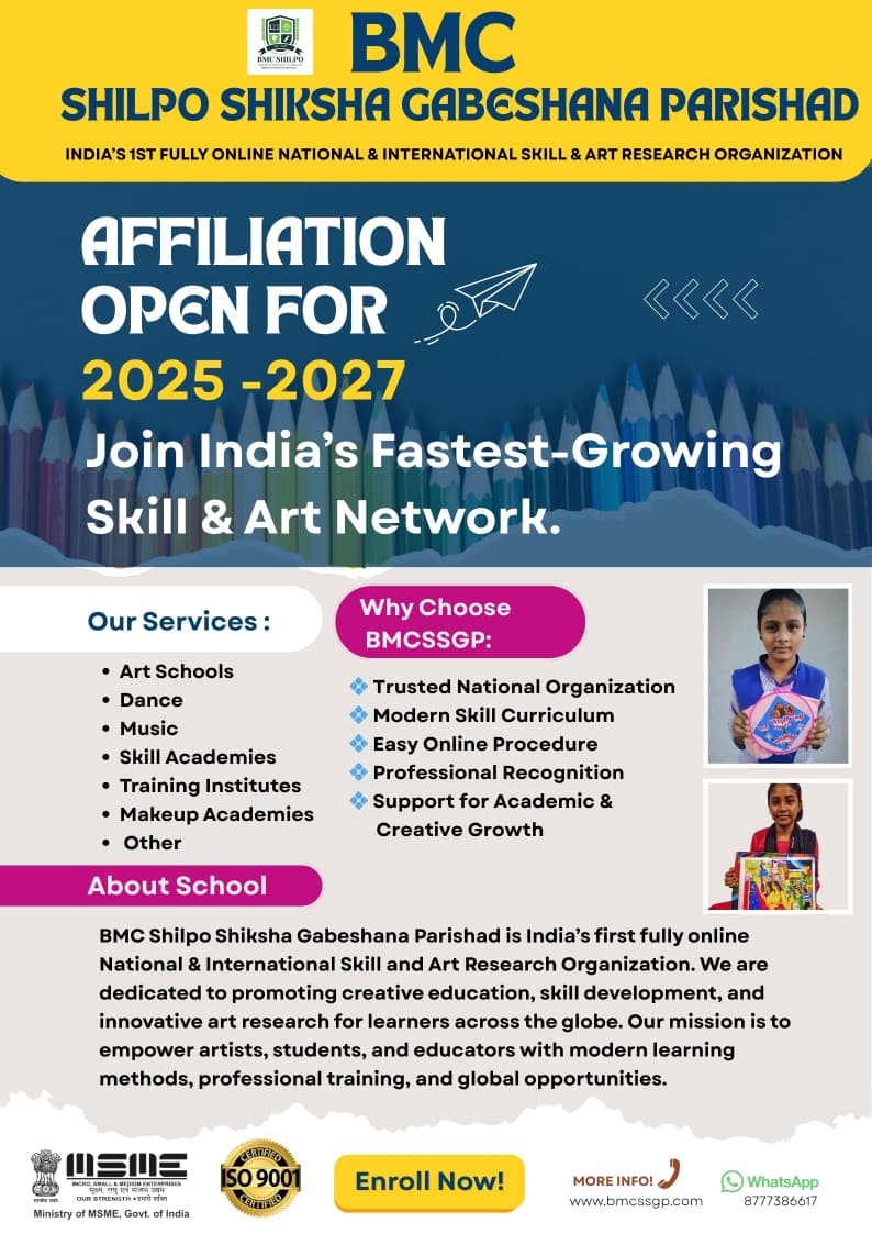 BMC Shilpo Shiksha Gabeshana Parishad is a legally recognized Skill Development and Art Research Organization providing world-class training, certification, and affiliation. We connect schools, colleges, academies, artists, and institutions through a unified digital platform to ensure quality education, professional growth, and global opportunities.